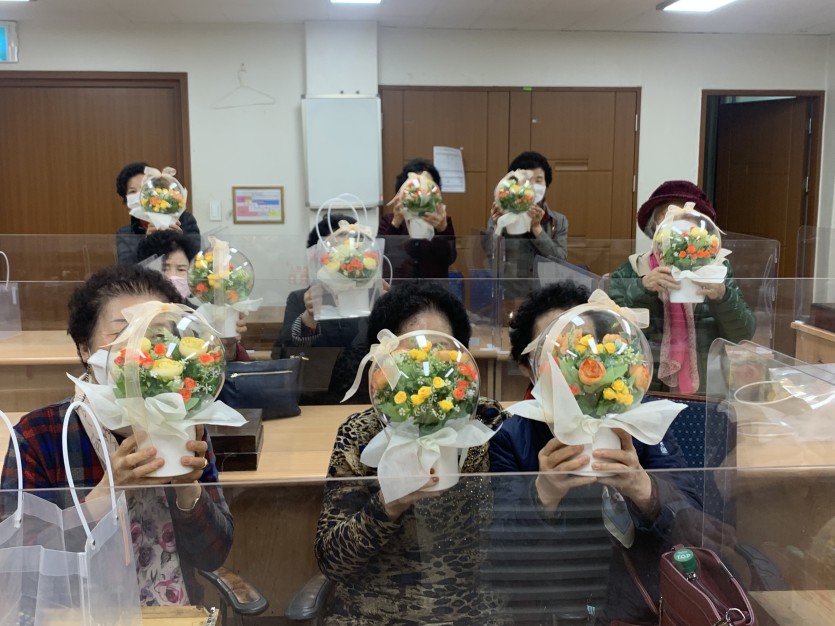 11월 17일(수), 북구치매안심센터와 연계한 치매예방교실 4회차를 진행하였습니다. 이번 시간은 꽃풍선 만들기로 꽃을 자르고 끼우는 작업에 어려움이 있었지만 완성한 모습을 보니 어르신들 모두가 행복해보이셨습니다^^ 수고하셨습니다.