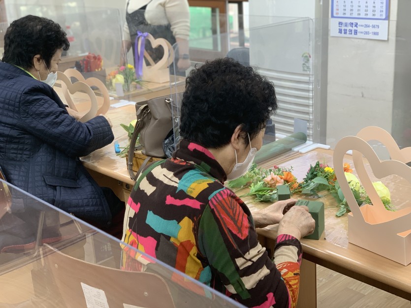 이 날은 원예수업으로 조화로 진행하였지만 꽃꽃이를 하며 어르신들이 기분전환을 할 수 있는 기회가 되었습니다.
