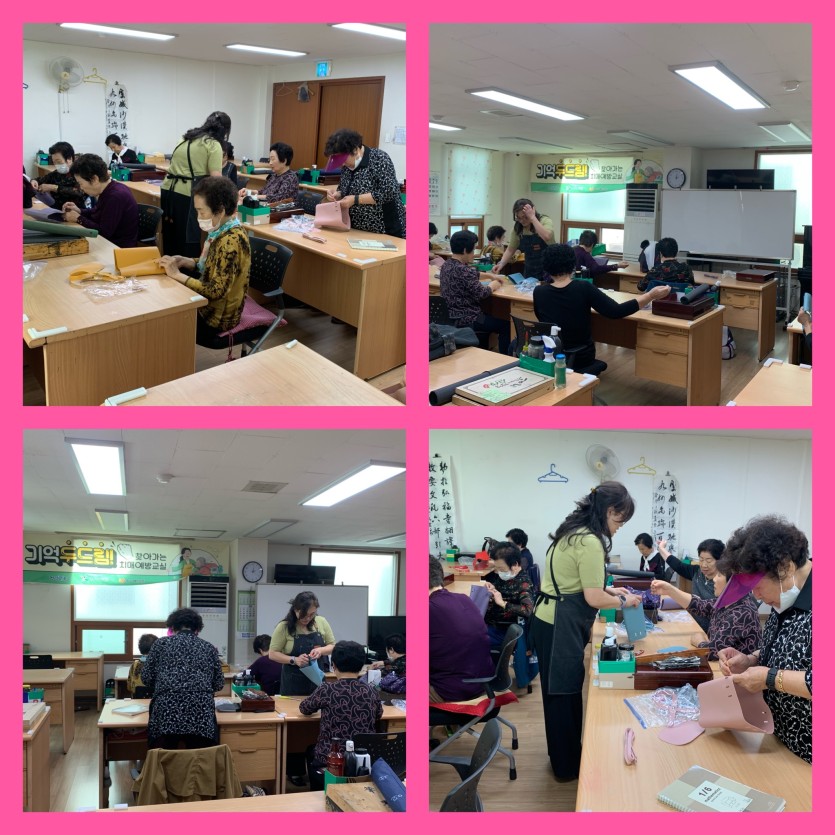 이 날은 가죽가방 만들기로 초안은 강사님이 잡아주시고 어르신들의 손 운동을 위하여 바느질을 할 수 있는 시간이 되었습니다. 젊었을 때 바느질은 일상이었다며 좋아하시는 분들도 계셨으나 눈이 침침해서 구멍이 보이지 않는다는 어르신들까지 모두가 가죽가방을 완성시켜 돌아가는 시간이 되었습니다.