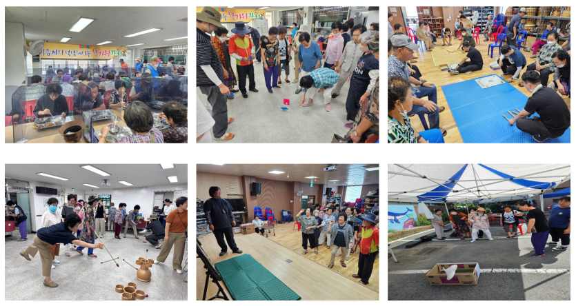 오전 행사가 끝난 후, 사랑의 식당에서는 영양사 선생님과 식당 여사님들이 정성껏 준비한 명절 음식을 대접했습니다. 야외에서는 도토리묵무침, 전, 막걸리, 시원한 커피를 제공하는 주막이 열려 잔치 분위기를 한층 더 북돋웠습니다. 이어서 윷놀이, 신발 던지기, 투호 던지기와 같은 민속놀이가 이어져 풍성한 한가위 잔치가 되었습니다.