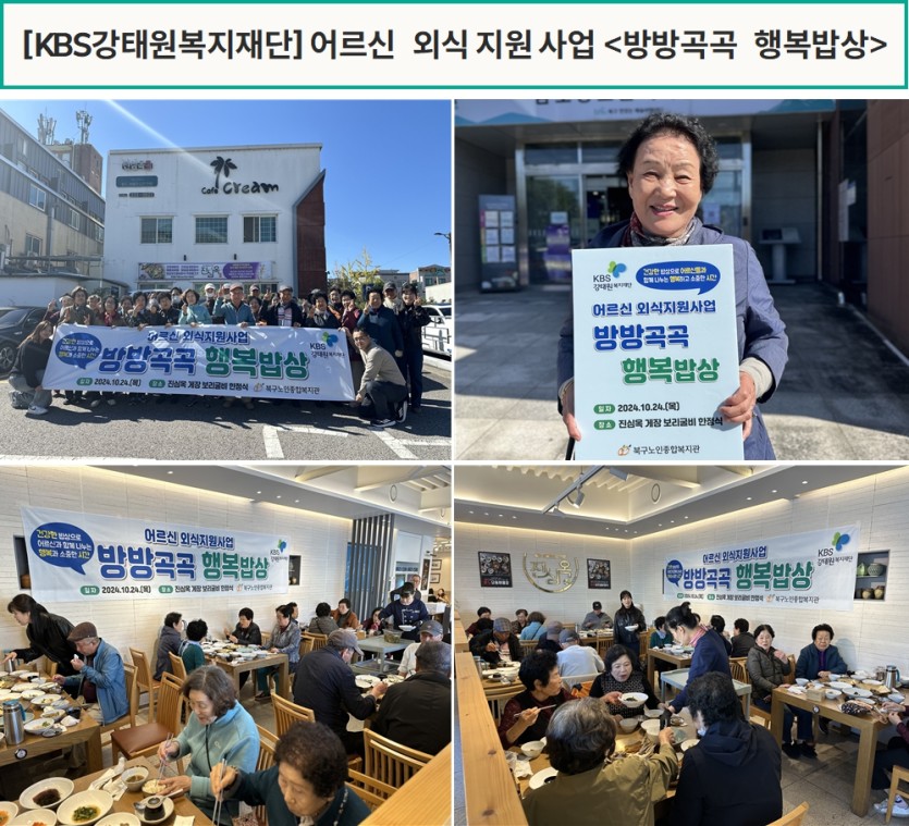 KBS강태원복지재단이 주최하는「방방곡곡 행복 밥상사업을 통해 ‘노인의 날’을 맞아 어르신들께 외식을 지원하여 균형 잡힌 식사를 제공하고, 새로운 식생활 경험과 사회적 교류 기회를 제공하여 삶의 질을 향상시키는 즐거운 시간이 되었습니다.