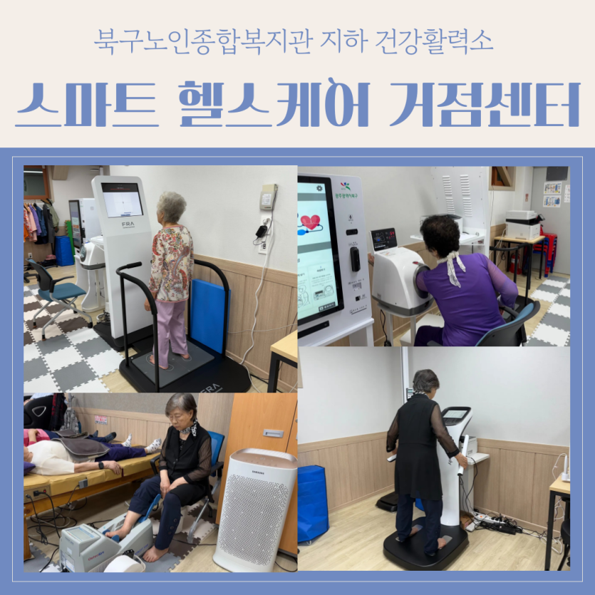 올해부터 우리 복지관은 어르신 몸앤마음 케어 스마트경로당 사업의 일환으로 지하 건강활력소 내에 스마트 헬스케어 거점센터를 운영하고 있습니다.