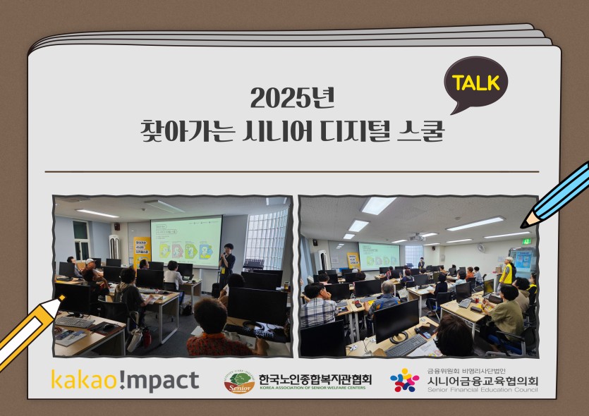"찾아가는 시니어 디지털 스쿨"은 카카오임팩트재단의 지원과 한국노인종합복지관협회, 시니어금융교육협의회의 공동 주관으로 운영되며, 디지털 기술에 익숙하지 않은 어르신들을 위해 스마트폰의 기초부터 생활 속 활용 방법까지 쉽고 친절하게 알려드리는 교육입니다.