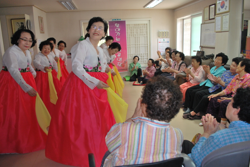 노인일자리사업 은빛공연단을 연계하여 시범경로당 6개소에 우리춤공연을 하였다..흥겨운 우리가락과 함께 우리춤공연을 보며 다같이 어우러진 신나는 한마당이 되었다.