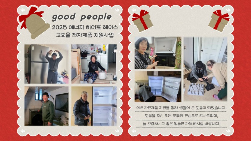 본 복지관은 굿피플이 주관하는 「2025 에너지 히어로 레이스 고효율 전자제품 지원사업」에 선정되어, 노인맞춤돌봄서비스 이용 어르신 11가구에 고효율 가전제품을 지원하였습니다.
