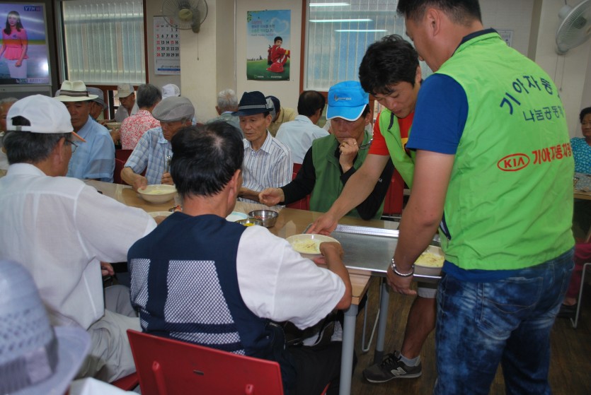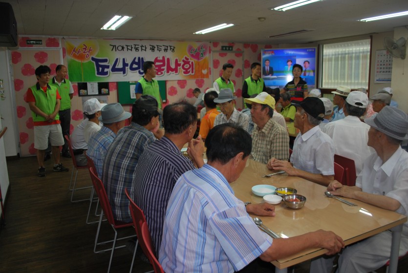2012년 8월 27일, 항상 사랑과 나눔을 실천하시는 기아자동차 조나반 봉사회가 방문하셔서 사랑의 식당 어르신들께 맛있고 구수한 콩물국수를 제공해 주셨습니다.