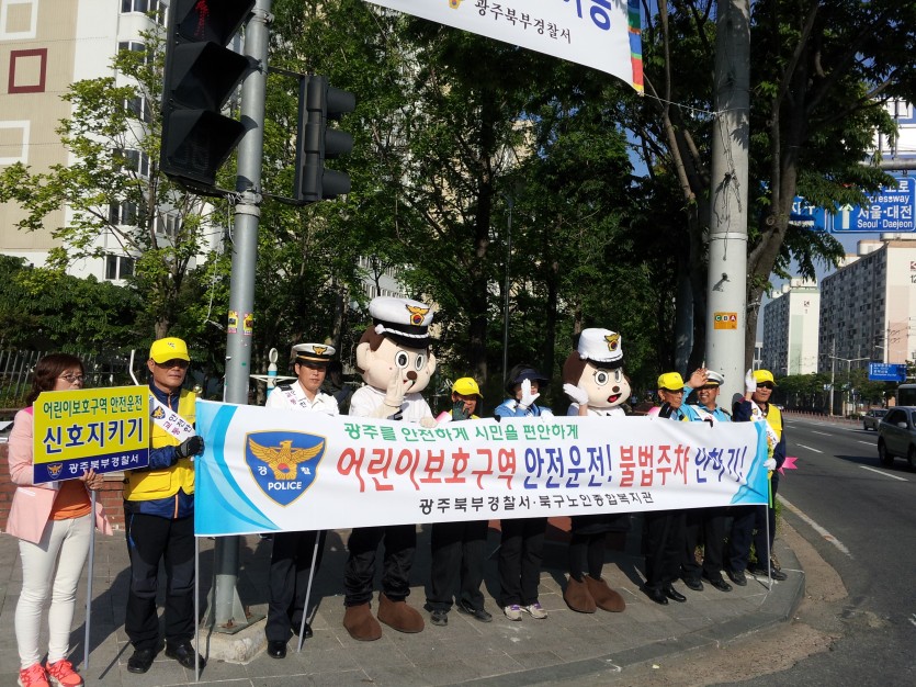 항상 초등학생들의 교통지킴이가 되어주고 있는 스쿨존 어르신들과 북부경찰서가 함께 손맞잡고 5월 14일 각화초등학교 사거리에서 교통캠페인을 실시하였습니다. "어린이 보호구역 안전운전"이라는 것을 다시 한번 인식시키면서 밝게 커 나가야 할 어린이를 위해 꼭 안전운전을 하시라는 염원을 담은 캠페인이었습니다.