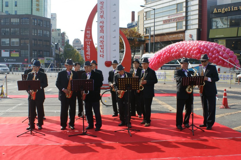 11월 22일(금) 색소폰 음악교실 회원어르신 15명을 모시고 구도청광장에서 진행되는 광주 사회복지공동모금회 제막식에 색소폰 공연봉사활동을 하였습니다 열띤 공연을 하신 15명의 어르신께 힘찬 박수를 보냅니다.