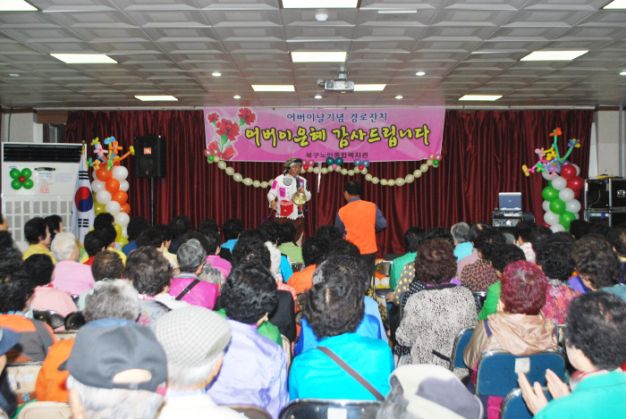 9시 30분부터 행사가 시작되었습니다. 사회자의 진행으로 레크리에이션, 어르신들의 장기자랑, 우산어린이집 아이들의 공연과 카네이션 달아주기 행사가 있었습니다. 11시 ~ 11:20분에는 어버이날 기념식을 가졌습니다. 기념식에서는 장한어버이상 시상이 있었고 김희준어르신과 조미순어르신이 수상하였습니다.