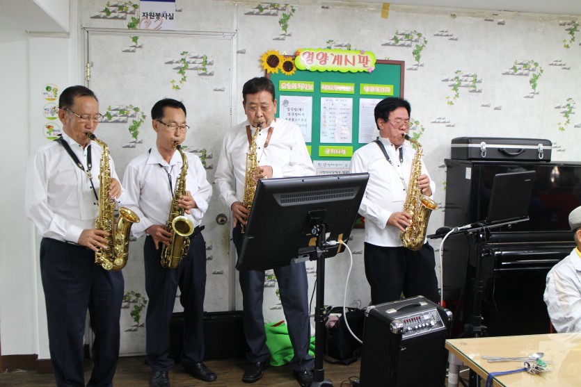 6월 7일(화), 본 기관의 노인자원봉사단 중 피리부는 사나이팀이 어르신들이 점심 식사를 하시기 전인 시간을 이용하여 즐거운 색소폰 공연을 보여드렸습니다 ~