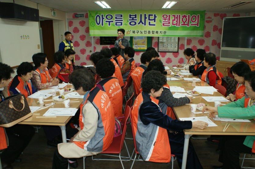 북구노인종합복지관 어르신 봉사단 중 '아우름 봉사단'이 2010년 처음으로 월례회의를 했습니다.