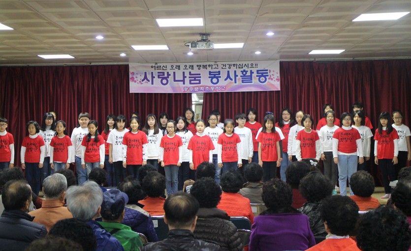 2016.11.9 우리 복지관과 협약중인 문화초등학교 학생들의 어르신 위안 방문 공연이 있었습니다. 댄스에서부터 하모니카, 내 나이가 어때서를 부르는 합창공연까지 어르신들의 "잘한다. 잘해"소리가 끊이질 않았고, 문화초에서 준비해 주신 간식까지 드시면서 정말 흐뭇해 하시는 어르신과, 아이들을 챙기는 어르신들 모습속에서 아직은 남아있는 우리네 경로효친 사상을 볼 수 있었습니다. 오늘 수고해 주신 문화초등학교 관계자분들께 다시 한번 감사드립니다.