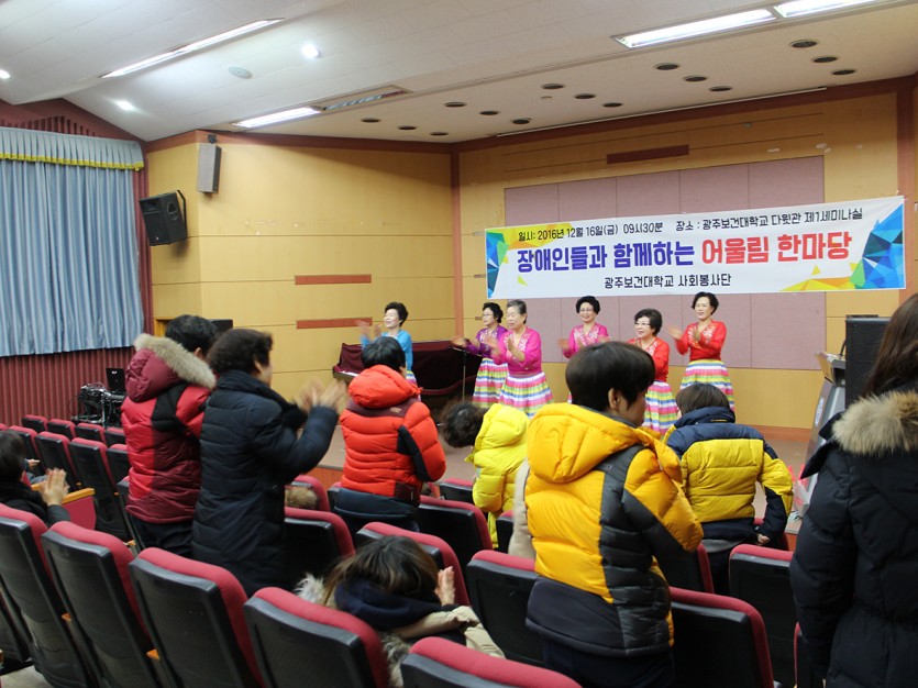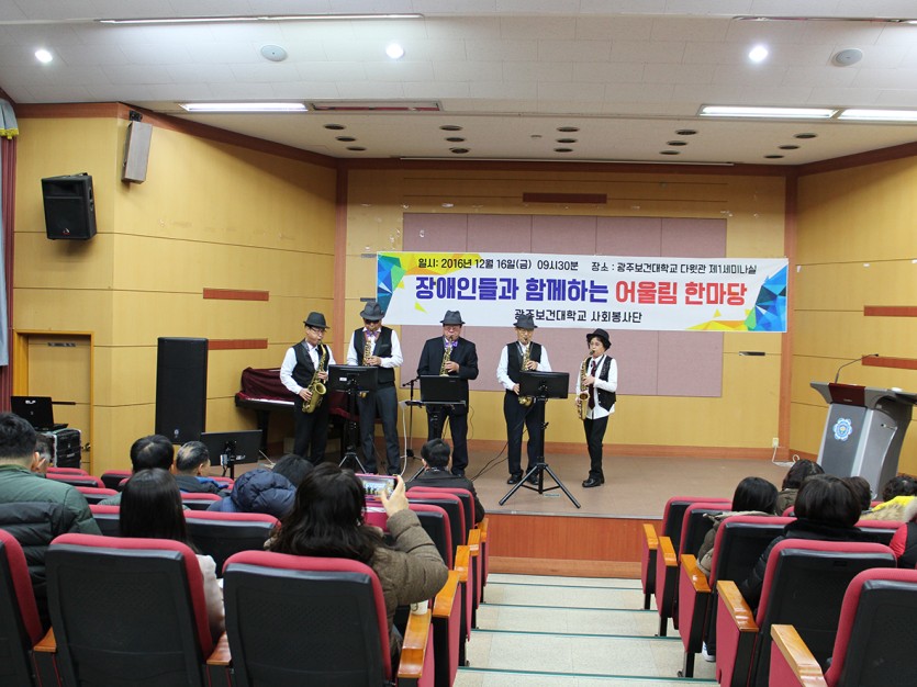 12월 16일(금) 광주보건대학교 사회봉사단에서 성인 지적 장애인 및 가족들을 대상으로 공연봉사 의뢰가 들어와 색소폰, 우리춤 어르신들과 함께 방문하여 공연을 진행하였습니다. 20분 공연을 하기로 하고 갔는데 추가 공연 요청으로 50분간의 공연 시간이 주워져 색소폰 7곡과 우리춤 6곡의 공연을 선보이며 함께 노래를 부르고 춤을 추며 어울리는 시간을 가졌답니다^^