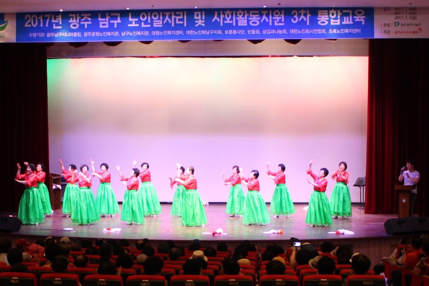 7월 5일 (수), 복지관 공연봉사단 2팀 (신바람, 은빛)의 어르신들이 남구 봉선동 남구문예회관을 방문하여 일자리 통합교육 식적공연 봉사를 실시하였습니다.