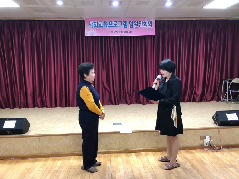 30일(금), 사회교육 프로그램 임원진들을 모시고 제 1차 임원진 회의를 진행하였습니다. 새로 선출된 임원진 어르신들에게 올 한해에도 잘 부탁드린다는 격려와 임명장을 수여하였으며, 상반기 은빛나들이 일정 등에 대한 논의를 하였습니다.