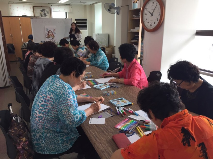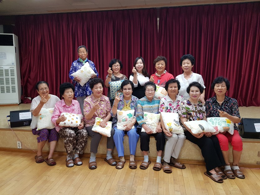 명찰, 부채, 텍스타일, 쿠션 등 여러 가지 작품활동을 통해 어르신들의 감정을 표현하고 이를 서로 공유함으로써 어르신들과 유대관계를 형성하고 치매예방에 도움이 될 수 있는 계기가 되었답니다. 마지막 수업으로는 웃음치료 프로그램으로 레크리에이션을 진행하여 다함께 노래와 율동, 호탕하게 웃기, 박수치기 등 게임을 통해 즐거운 시간을 보냈답니다^^