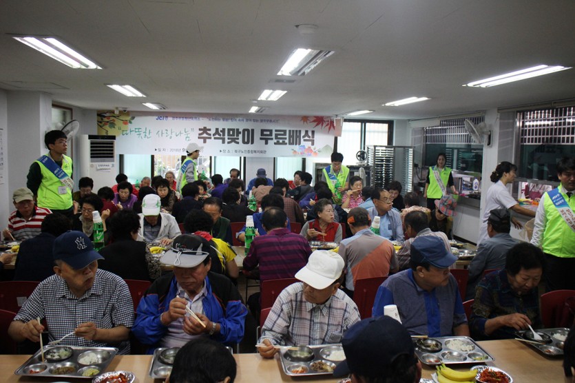 9월 19일(수), 추석을 앞두고 광주 무등청년회의소 후원으로 한가위 경로잔치를 진행하였습니다~ 오전에는 많은 분들이 참석해주신 가운데 북구노인종합복지관 직원들의 신나는 식전 공연을 시작으로 기념식 및 각설이, 우리춤, 사회복무요원 공연, 경품 추첨 등의 즐거운 시간을 보냈습니다.