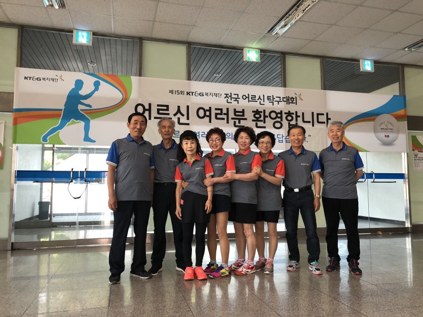 10월 25일(목), 2018년 제15회 KT&G복지재단 전국어르신탁구대회에 탁구회원어르신들이 선수로 참가하였습니다. 그동안 갈고 닦은 기량을 맘껏 뽐내지 못하여 아쉬웠지만 이번 대회를 통해 탁구를 사랑하시는 어르신들이 더욱 더 탁구를 사랑하는 마음이 생기고, 대회에서 보여준 열정적인 모습은 이번 대회를 빛나게 하였습니다.