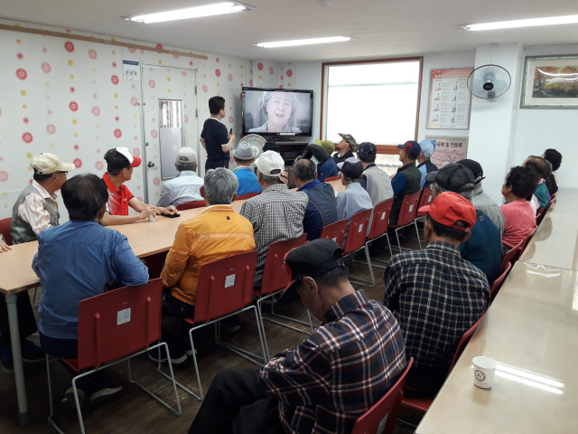 교육의 마무리는 보건복지부에서 제작한 홍보영상을 시청하는 것이었는데, 어르신들께 친숙하신 배우 최주봉씨가 출연하여 부주의 때문에 낙상을 당하는 경우를 잇달아 보여주었습니다. 익살스러운 상황들이 마치 한편의 꽁트와도 같아 어르신들도 웃으며 공감하셨고, 생각지도 못한 곳에서 낙상사고를 당할 수 있다는 것을 배워보는 시간을 가졌습니다.^^