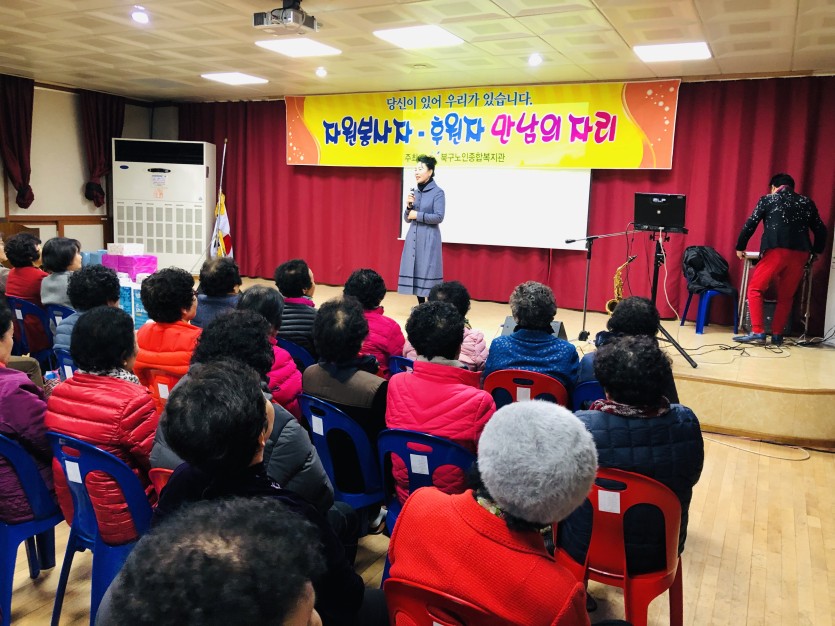 12월 2일(월), 한 해 동안 북구노인종합복지관을 후원해주시고 봉사해주신 자원봉사자·후원자 150여명을 모시고 만남의 자리 행사를 진행하였습니다. 복지관에 경제적·정서적인 지원을 줌으로써 실질적인 복지향상에 기여해주시신 분들께 자원봉사자·후원자 만남의 자리를 통해 격려와 노고를 치하하는 시간이 되었답니다. 항상 본 복지관을 위해 사랑과 봉사의 정신으로 마음을 나누어 주시는 모든 분들께 진심으로 감사드립니다♡