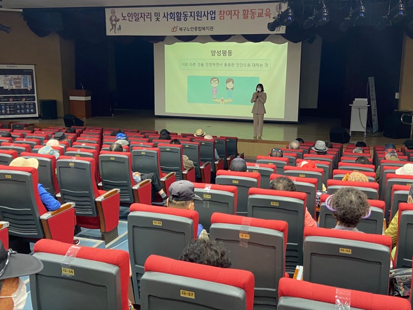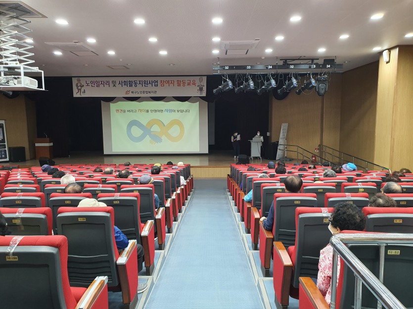 2021년 4월 26일 부터 30일 까지 북구 청소년수련관에서 노인일자리 및 사회활동지원사업 2회차 교육이 이루어졌습니다. 977명의 노인 일자리 참여 어르신을 대상으로 교통 안전 교육, 양성평등, 학대예방 교육 및 장애인 인식개선 교육을 진행하였습니다. 마스크 착용, 발열 체크, 거리 유지 등을 준수하였으며 참여 어르신들 또한 방역지침을 잘 지켜 주시고적극적인 자세로 참여 해 주셔서 교육을 무사히 마칠 수 있었습니다. 코로나가 조금씩 다시 확산되어가고 있어 어르신들의 건강이 염려되는 요즘 입니다. 모든 사업단 어르신들이 올 한 해 건강하게 일자리 활동을 진행 할 수 있도록 응원하고 함께 하겠습니다. 항상 성실하게 일자리 활동을 진행 해주시는 모든 어르신들께 감사드리며 올 한해 힘내 보아요~^^