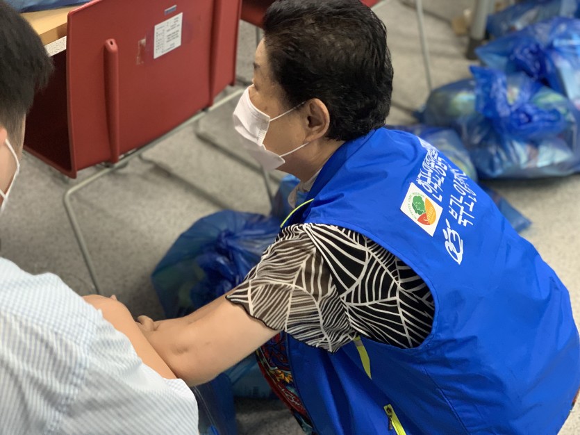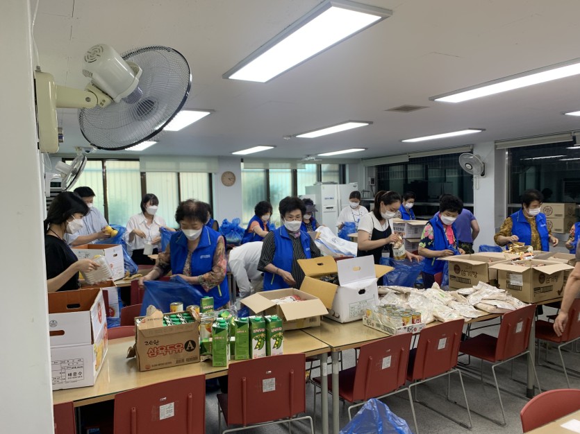 (사랑의식당 미운영으로 수급자 및 차상위 어르신들께 전달할 대체식품 포장 활동 진행)