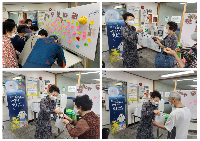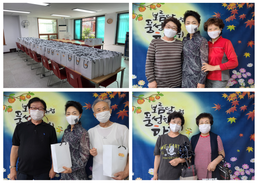 이번 경로잔치는 한가위 보따리(약과, 송편, 마스크)전달, 한가위 한마디 작성, 포토존 촬영으로 간소하게 진행되었습니다.