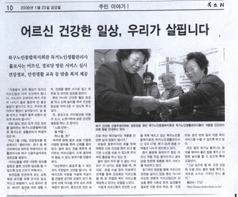 본 귀관에서는 홀로사는 어르신, 경로당에 정기적인 방문을 통해 어르신의 안전을 살피고 있을 뿐만 아니라 비슷한 연령대 어르신들간의 만남을 통한 사회성 증대, 실생활에 필요한 각종 정보 제공, 병.의원 무료 검진 연계 등의 각종 복지 서비스를 누릴수 있도록 하고있다.