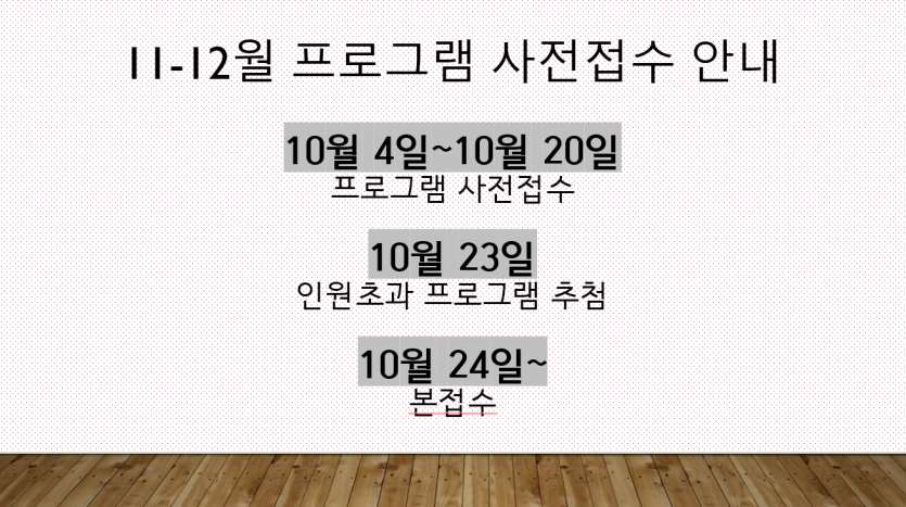 11-12월 프로그램 사전접수 안내 게시글 작성정보 작성자 광주북구노인종합복지관 작성일 23-09-27 14:51 조회수 1,200 댓글수 0 목록 게시글 본문 11-12월 프로그램 사전접수 안내 첨부파일 1개 화면 캡처 2023-09-27 145056.png (217.8K) 0회 다운로드 첨부일시 : 2023-09-27 14:51:27 이전글 2023년 제 3차 북구노인종합복지관 운영위원회 회의록 공개 23-10-04 다음글 2023년 북구노인종합복지관 불용물품 매각 공고 23-09-15 댓글 0 등록된 댓글이 없습니다. 목록