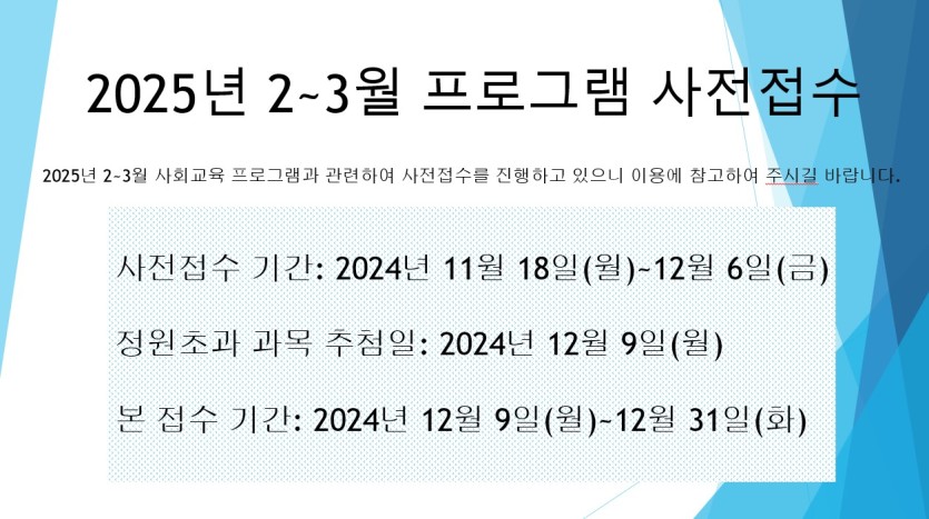 2025년 2~3월 사회교육프로그램 사전접수를 진행하고 있으니 많은 참여 바랍니다^^