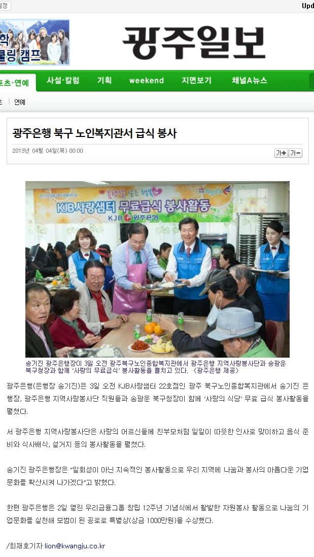 광주은행 무료급식 자원봉사 관련 보도자료 입니다.