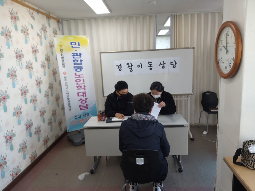 11월 17일(수), 광주노인보호전문기관과 연계하여 민관이동상담을 진행하였습니다. 어르신이 궁금한 질문을 미리 준비해 오고 그에 대해 경찰관이 답변을 하며 만족스러운 상담이 되었습니다.