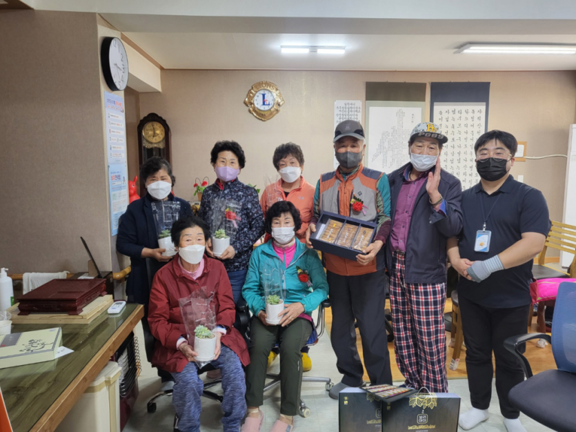 어버이날을 맞아 시범경로당 15개소를 방문하여 이용 어르신들에게 꽃 화분과 어버이날 선물을 전달하였습니다. 어르신들께서 경로당을 위하여 힘써줘서 복지관에 감사하다고 말씀하시며 웃으며 함께 덕담을 나누며 좋은 시간이었습니다.