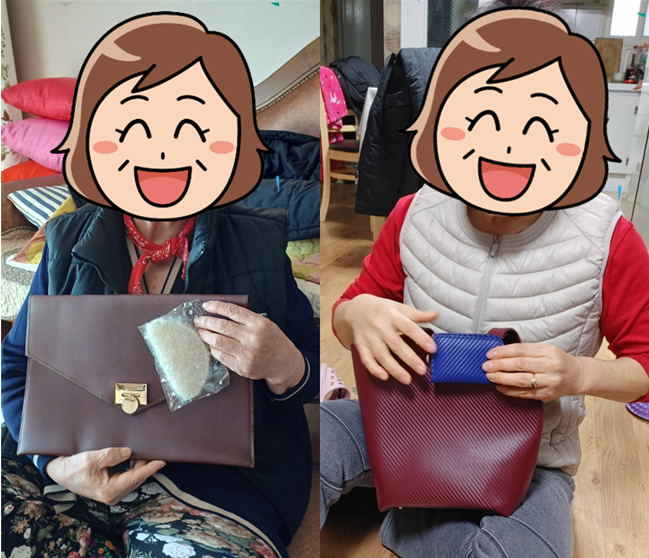한국노인인력개발원과 광주광역시 북구청의 도움을 받아 진행하는 구구팔팔공방사업단은 다양한 공예품을 어르신들께서 한 땀 한 땀 정성 들여 만들어 판매를 하거나 복지기관에 후원을 하고 있습니다. 지갑, 가방, 열쇠고리, 수세미 등을 전달받은 노인맞춤돌봄서비스 대상자 어르신들께서는 가죽이 짱짱하고 색이 예뻐서 친구들 만나러 갈 때 자랑해야겠다며 너무 좋아하셨습니다.