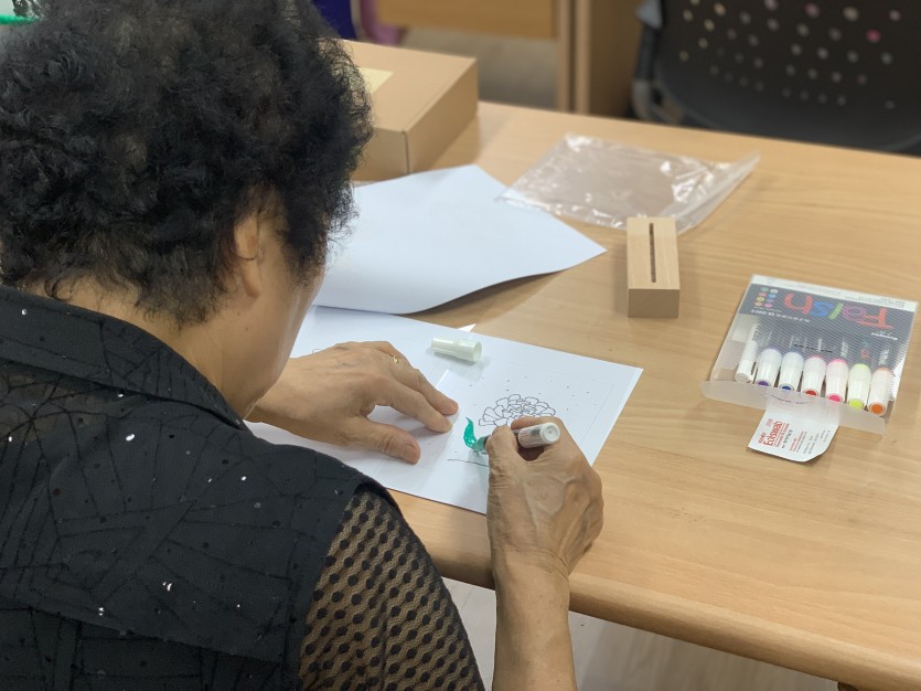 첫 수업은 LED 아크릴에 그림그리기를 진행하였으며 어르신들 스스로가 그리고 싶은 그림을 연습 후 아크릴에 그려보는 시간을 가졌습니다. 전년도에도 참석하신 어르신들이 프로그램에 대해 매년 이런 기회를 줘서 너무 감사하다고 만족해하셨습니다^^