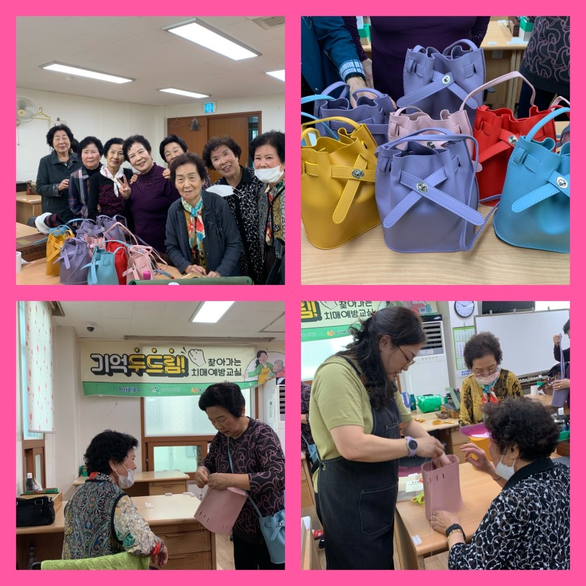 이 날은 가죽가방 만들기로 초안은 강사님이 잡아주시고 어르신들의 손 운동을 위하여 바느질을 할 수 있는 시간이 되었습니다. 젊었을 때 바느질은 일상이었다며 좋아하시는 분들도 계셨으나 눈이 침침해서 구멍이 보이지 않는다는 어르신들까지 모두가 가죽가방을 완성시켜 돌아가는 시간이 되었습니다.