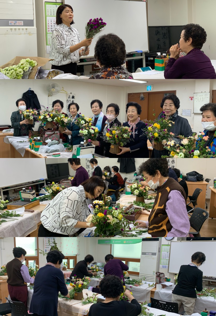 평소에 봐왔으면서도 이름을 모르던 꽃, 처음보는 꽃 등 여러가지의 꽃들을 직접 바구니에 꽂아 싱그러운 향을 맡으며 기분좋게 수업에 참여하는 시간이 되었습니다. 나에게 주는 선물이라는 주제로 수업을 진행하니 어르신들도 즐거운 경험이 되지 않았을까 싶습니다.