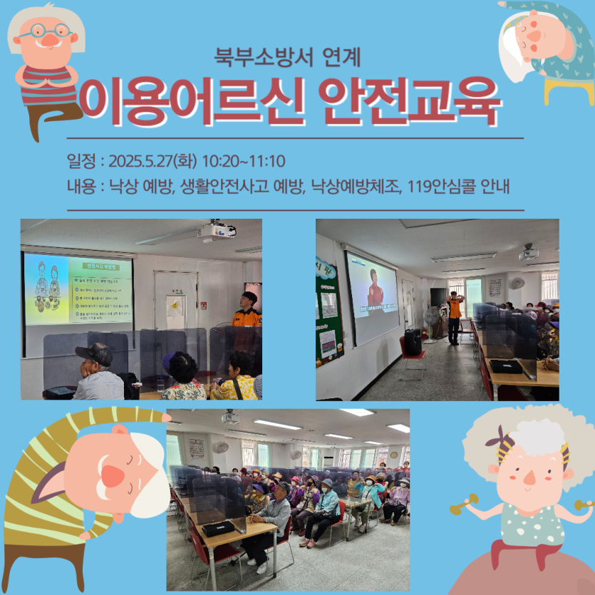5월 27일(화), 복지관 이용어르신들을 대상으로 북부소방서와 연계하여 안전교육을 진행하였습니다.