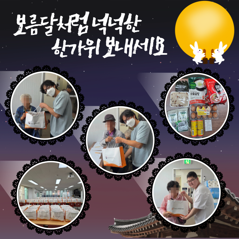 이번 꾸러미는 모싯잎송편, 사골곰탕, 식혜, 도시락김, 찰밥, 계란 10구, 라면으로 구성되었으며, 어르신들께서 풍성하고 따뜻한 한가위를 보내실 수 있도록 정성을 담아 준비하였습니다.