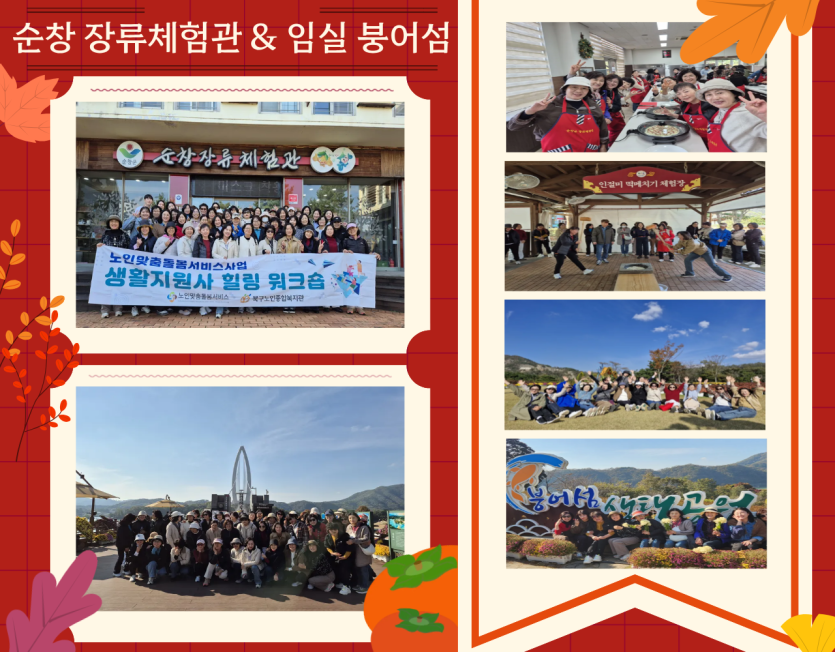 노인맞춤돌봄서비스에서는 생활지원사의 소통과 연대 강화,정서적 안정 및 재충전의 기회를 가지기 위해 순창 장류체험관에서 떡으로 만드는 고추장피자와 떡매치기, 뻥튀기 체험을 진행하였고 임실 붕어섬 생태공원 탐방을 통해 일상적인 업무에서 멋어나다양한 체험과 자연 속 힐링을 경험하는 시간을 가졌습니다.