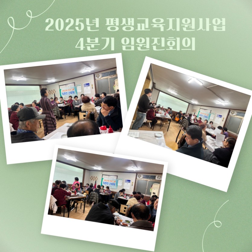 12월 11일(목), 평생교육지원사업 4분기 임원진 회의를 진행하였습니다. 회의에서는 동계방학안내, 프로그램 접수 안내, 2026년 수강료 인상 안내 등 기타안건에 대한 의견을 나누는 시간을 가졌으며, 각 프로그램의 애로사항 및 건의사항에 대한 의견을 나누는 시간을 가졌습니다.