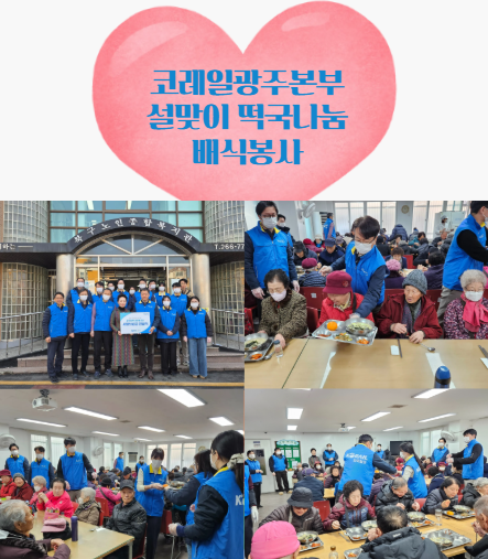 2월 13일(금), 코레일 광주본부 사회봉사단이 복지관을 방문해 설 맞이 떡국 나눔 행사를 후원하고 배식 봉사 활동에 참여해 주셨습니다. 이번 행사는 떡국떡과 레드향 과일을 후원해주심에 따라 더욱 풍성하게 진행되었으며 특히 복지관을 이용하시는 모든 어르신들에게 식사를 제공해 드릴 수 있어서 뜻 깊었습니다. 배식 봉사를 통하여 정성 어린 인사를 드리고 따뜻한 마음을 나누었으며, 이 시간은 단순한 한 끼를 넘어 마음까지 채워지는 소중한 순간이 되었습니다.