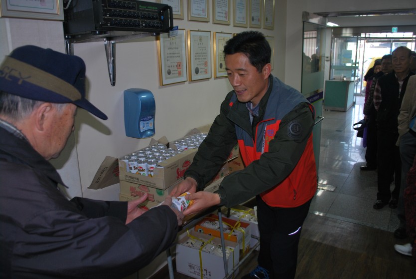 2012년 11월 19일 단풍색깔만큼이나 이쁜 조끼를 입고 어김없이 어르신들을 뵈러 오셨습니다. 2012년의 마지막 봉사활동이라면서 두손에 떡과 음료, 쌀을 가지고 오시면서 올해도 건강하셨으니 내년에도 꼭 뵈었으면 한다는 말씀을 잊지 않으셨습니다.