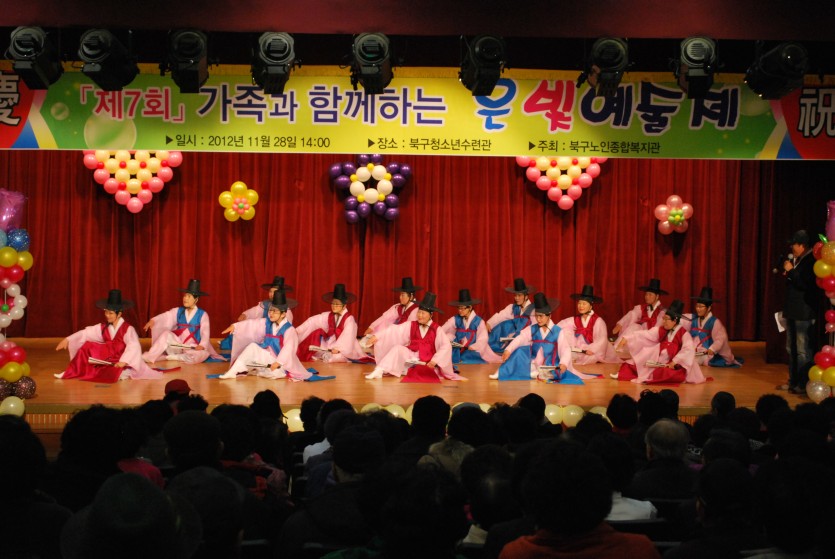 흐르는 세월을 막을수는 없지만 단지 나이는 숫자에 불과하다는 것을 보여준 북구노인종합복지관 제7회 은빛예술제가 11월 28일 14:00 북구청소년수련관에서 개최되었습니다. 1년동안 배운 프로그램을 올리는 순간이어서 어르신들의 상기된 모습에서 부터 긴장감, 그리고 무대장악력까지 어르신들의 세월과 노력이 그대로 묻어나는 순간이었습니다. 어르신들.. 너무 고생많으셨고 저희 직원들 모두 어르신들 사랑합니다.