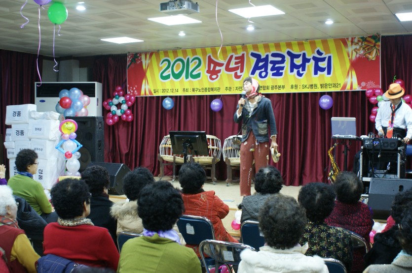 2012년 송년경로잔치가 12월 14일 10시부터 있었습니다. 이번 행사는 자전거사랑전국연합회 광주본부와 연계하여 안과진료 및 기본건강상담, 그리고 어르신들을 위한 위안잔치로 진행되었습니다.