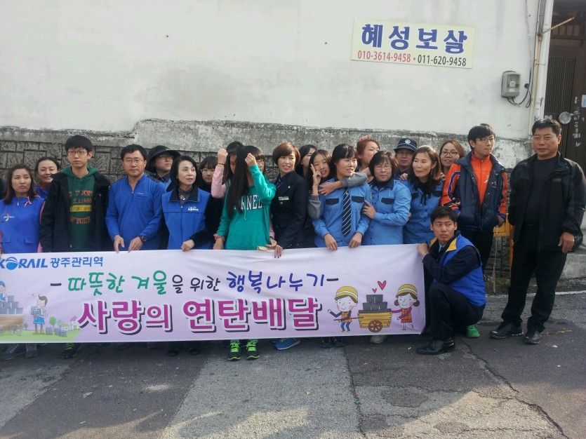 11월 7일 광주역 직원분들과 북구 녹색어머니회 회원분들이 추운 겨울을 따듯하게 보낼 수 있도록 사랑의 연탄을 전달해 주셨습니다. 빨리 추워지는 날씨에 걱정있었는데 직접 배달도 해주고, 연탄창고가 가득하여 부자가 된것같다고 흐뭇해 하시는 어르신들의 모습을 보고 봉사하신분들도 덩달아 좋았다고 오늘 하루 보람된 날이었다고 모두들 좋아하였습니다.
