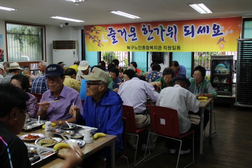즐거운 추석을 맞이하여 관장님과 북구의원님들의 인사말을 시작으로 한가위잔치가 열렸답니다. 어르신들을 모시고 윷놀이, 신발던지기, 훌라후프 등 즐거운 놀이로 색다른 재미를 느낄 수 있는 시간이 되었고, 가족같은 분위기 속에서 사랑과 정성을 가득 담아 음식을 대접해 드렸는데 어르신들이 푸짐하게 차린 음식을 드시고 행복해 하시는 모습을 보니 저희들 또한 행복해지는 날이였습니다.