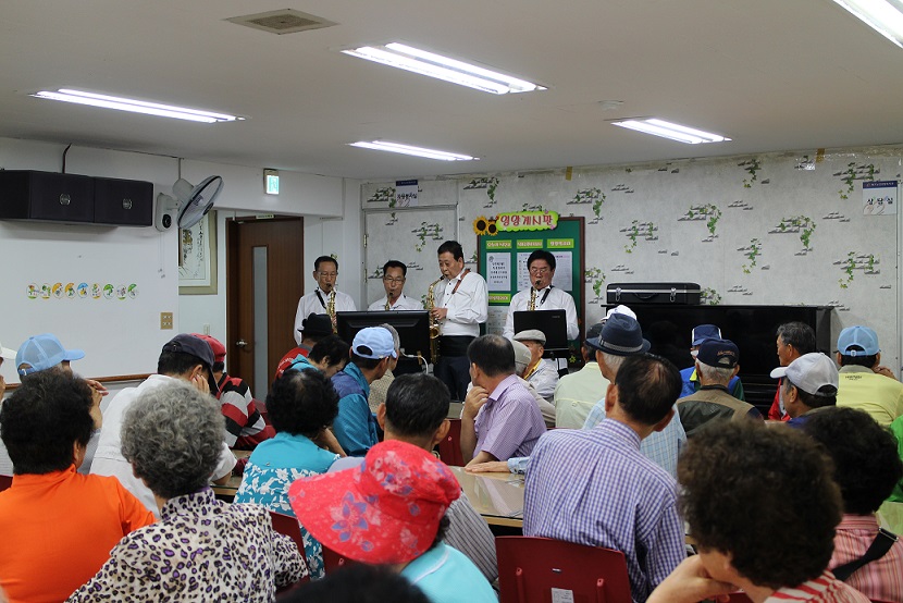 6월 7일(화), 본 기관의 노인자원봉사단 중 피리부는 사나이팀이 어르신들이 점심 식사를 하시기 전인 시간을 이용하여 즐거운 색소폰 공연을 보여드렸습니다 ~