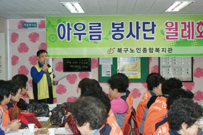 북구노인종합복지관 어르신 봉사단 중 '아우름 봉사단'이 2010년 처음으로 월례회의를 했습니다.
