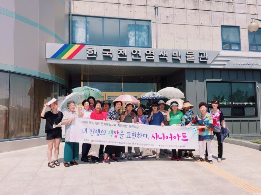 한국노인종합복지관협회, 문화체육관광부, 한국문화예술교육진흥원에서 지원하는 2016 복지기관 문화예술교육지원사업 노인미술<시니어아트> 현장학습을 다녀왔습니다. 나주천연염색박물관에서 손수건과 스카프 쪽염색체험을 진행했습니다. 모두들 직접만든 손수건과 스카프를 보며 천연염색에 대해 체험하는 시간도 갖고 박물관 견학을 통해 다른 색감을 낼 수 있는 천연염색공예에 대해 배울 수 있는 즐거운 시간이었습니다.